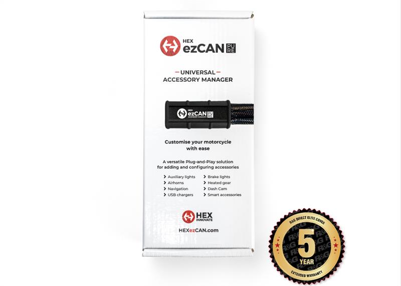HEX ezCANs purchased from R&G come with R&G Direct Elite Cover, giving riders an exclusive 5-year extended warranty from the date the device is registered. The warranty is valid only if the device has been registered using the HEX ezCAN configuration software, and the device and its wiring have not been tampered with.