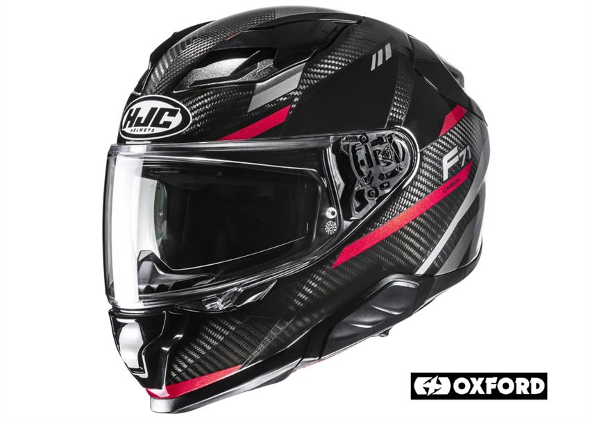 Meet the HJC F71 Carbon from Oxford, a modern sport-touring helmet that's lightweight and packed with rider-friendly features. Its aerodynamic shell ensures great performance at high speeds and is lightweight thanks to its Carbon Fibre construction.It comes with a Dynamic Multi-Step Sunshield for sun protection and a wider eye port for a better field of view. The 3D contour design ensures a secure fit for added safety and comfort. The newly added Two-Way Pivot Ratchet system will provide the helmet with a better seal and smooth ratchet movement. If needed, it is designed for a comfortable fit with glasses. For emergencies, there's an Emergency pull tab on the Cheek Pads for quick and safe removal. The newly added reflective trim along the padding enhances safety.