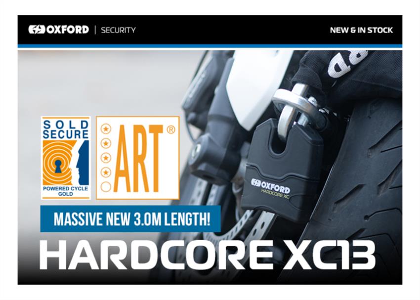 The Oxford Hardcore XC13 is the UK’s biggest selling approved chain & padlock. The chain has 13mm square chain links and a sleeve to help protect paintwork.The padlock is made with a hardened steel lock body and uses a hardened steel 11mm concealed shackle for maximum protection against attack.
