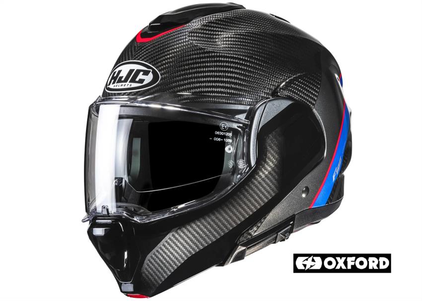 The new HJC F100 Carbon from Oxford is a multi system helmet with carbon fibre outer shell that provides a more lightweight and comfortable shell with enhanced Shock-Resistant performance.Combining the features of a full-face helmet and an open-face helmet, the chin bar can be flipped up to transform the helmet into a more open configuration. The rider can have the protection of a full-face helmet when the chin bar is down, and the convenience of an open-face style helmet when the chin bar is flipped up.