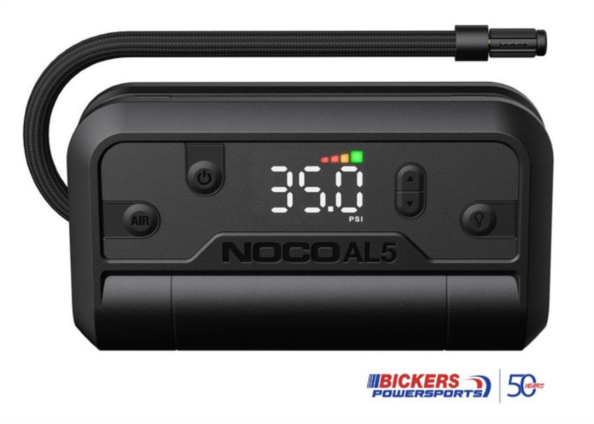 The NOCO AL5 lithium air inflator from Bickers Powersports is a 12-volt, 5-amp portable air compressor with a 138-watt motor rated at a maximum pressure of 130 PSI.The AL5 5A Lithium Air Inflator is designed for ultimate portability and convenience. It is a powerful and compact solution for inflating everything from motorcycle, car and bicycle tyres to sports equipment and inflatable toys.