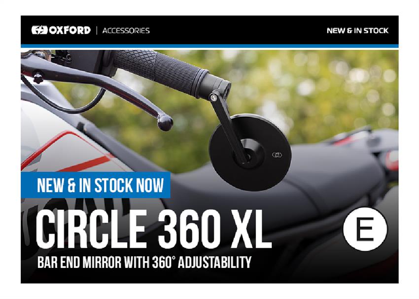 The Circle 360 XL bar-end mirror is now over 25% bigger! Oxford’s first E-Marked bar-end mirror meets the road safety standards required for MOT without having additional stem mirrors fitted.A premium bar end mirror which offers 360° adjustability, machined from billet aluminium and features anti-glare convex glass. This mirror is designed to fit 22mm / 7/8" handlebars.