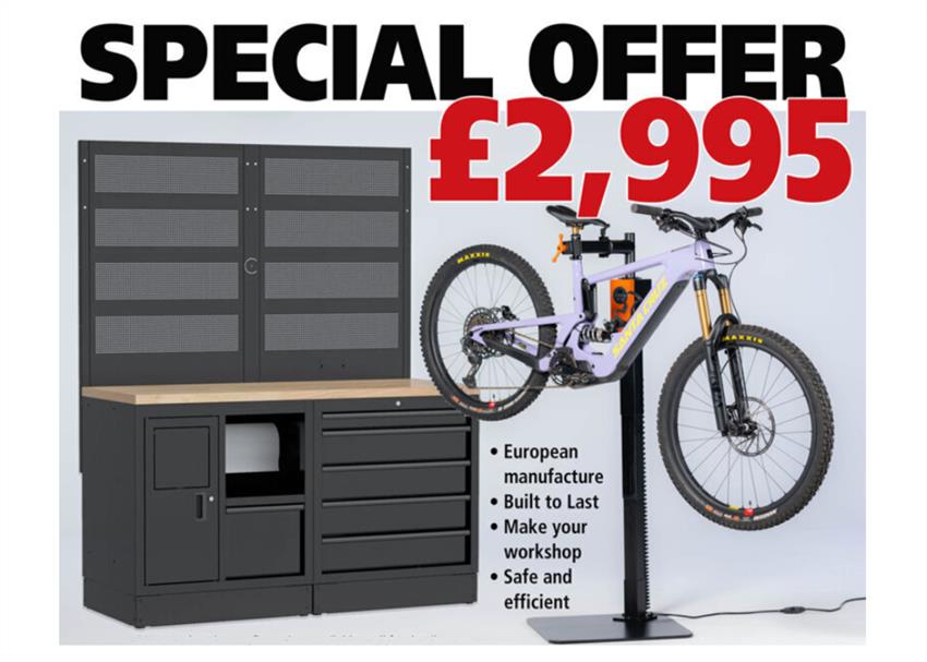 RS Workshop Equipment has a unique new product combination that not only offers top quality Italian workshop cabinets in a variety of configurations, but also includes a workstation to ensure quality, professionalism and a consistent stylish look for the workshop and technicians.Featuring the RS electrically operated bicycle lift with FEEDBACK ProElite Clamp included, plus an RS EVS016-0W workbench cabinet with five lockable drawers, tool gird, wooden worktop, waste bin and paper roll dispenser the cabinet comes ready assembled to install and be up and running the same day.*